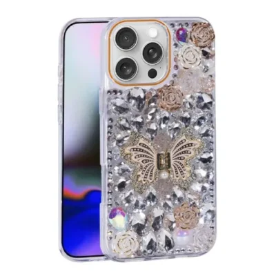 iPhone 16 Luxury Diamond Butterfly Kickstand Case With Strap White