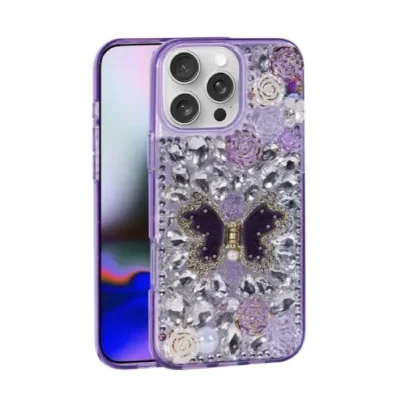 iPhone13/12 Pro Max Luxury Diamond Butterfly Kickstand Case With Strap Purple